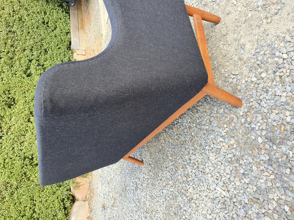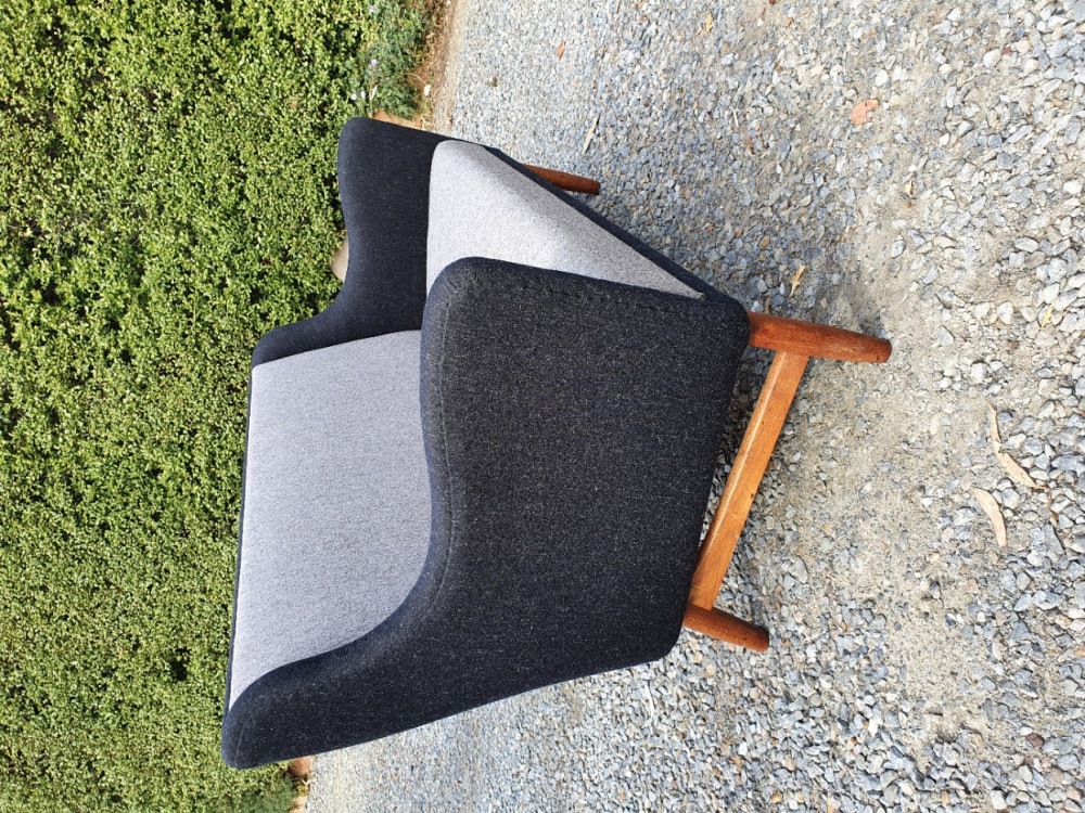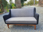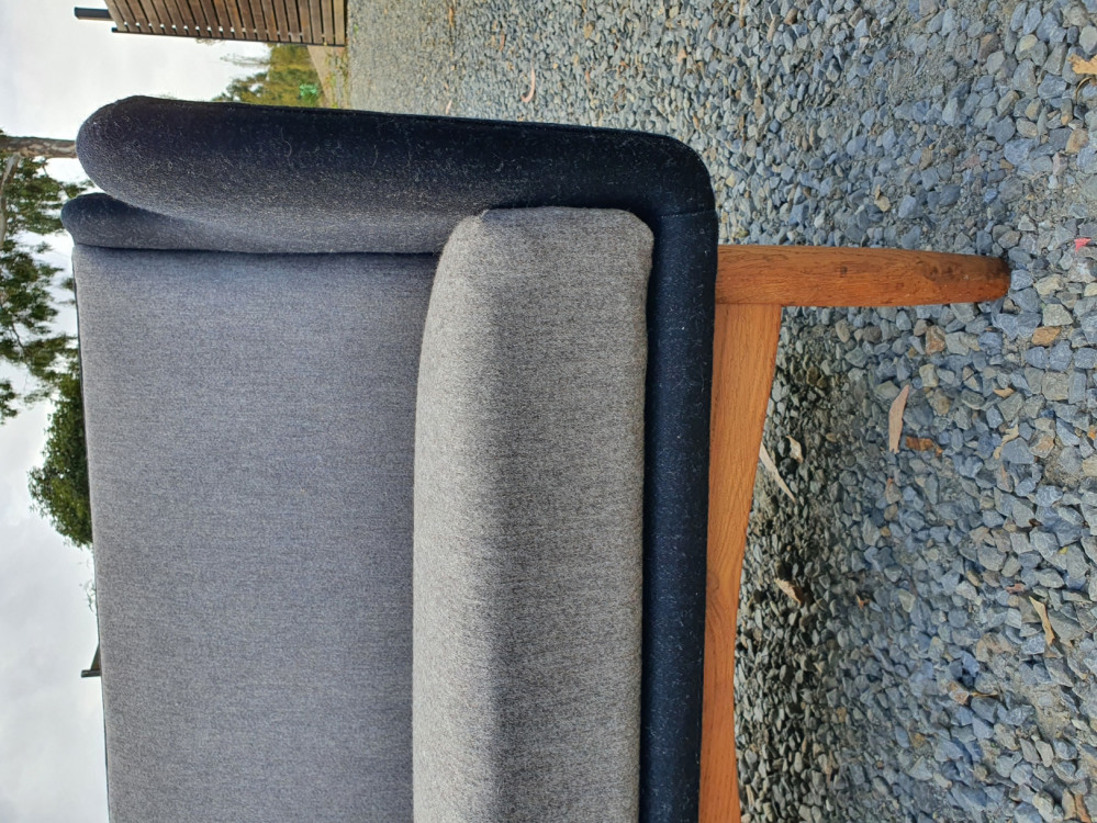 Superb two person sofa designed by Finn Juhl and manufactured by Soren Willadsen in Denmark Circa 1950's. Very hard to find model which has been recovered in Gabriel Savak two tone wool. Oak base.