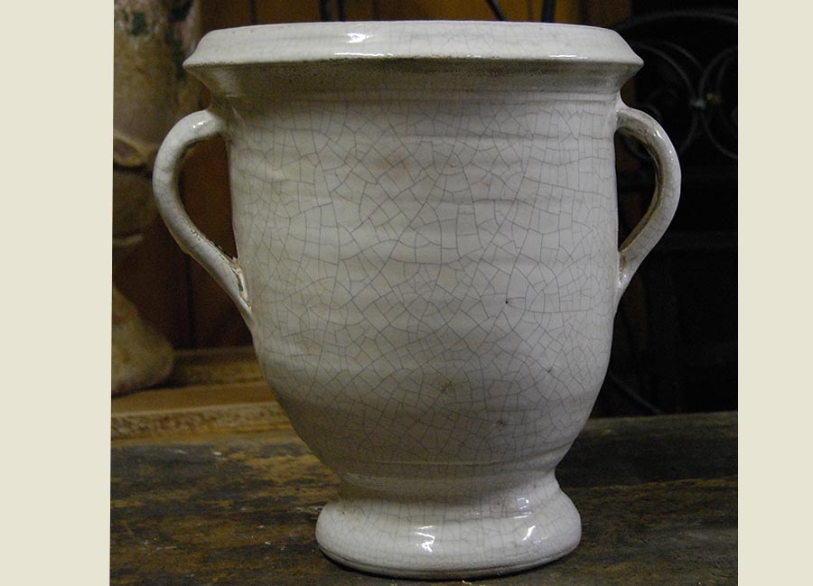 Traditional handmade French Anduze terra cotta 2 handled garden urn. White crackle lead glaze. Completely handmade in France by traditional methods, signed and numbered by potter. A stunning addition to any garden, courtyard or interior.