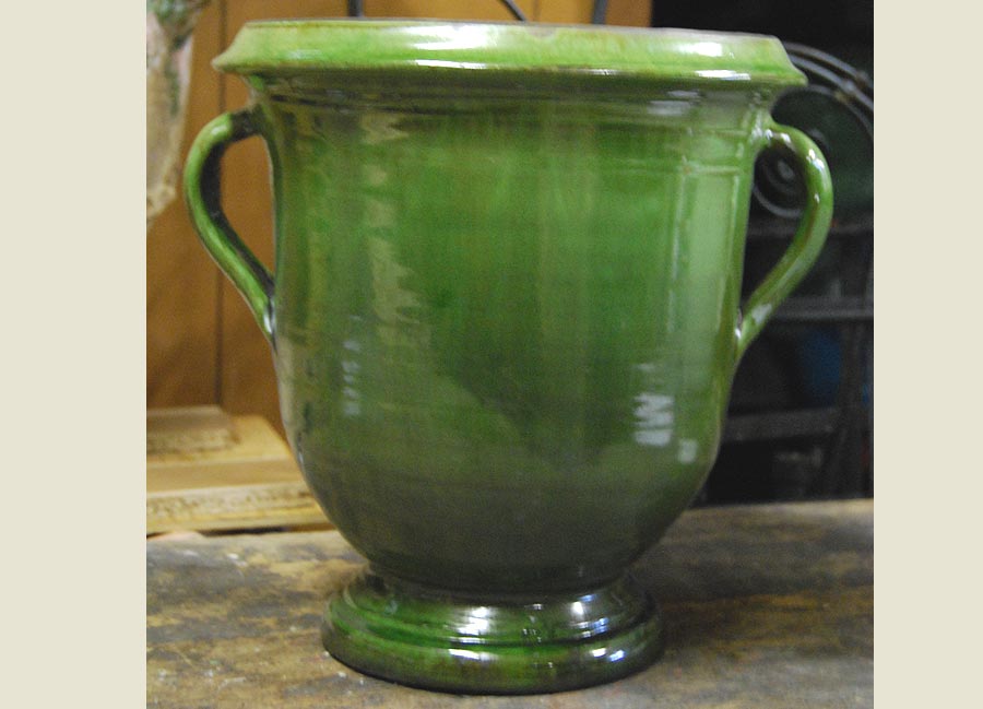 Traditional handmade French Anduze terra cotta 2 handled garden urn. Green lead glaze. Completely handmade in France by traditional methods, signed and numbered by potter. A stunning addition to any garden, courtyard or interior.