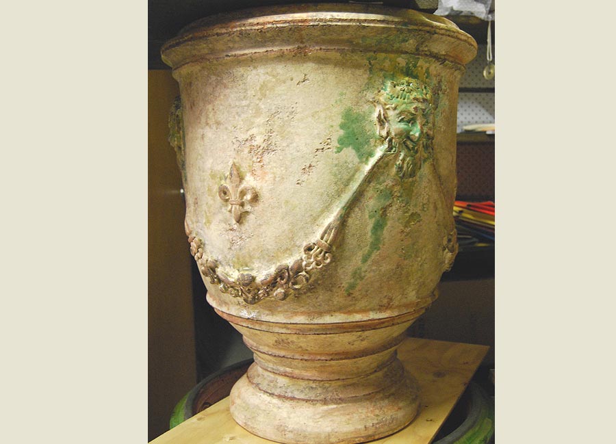 Traditional handmade French prestige XVIIth century model Anduze terra cotta garden urn. Antique finish. Completely handmade in France by traditional methods, signed and numbered by potter. A stunning addition to any garden, courtyard or interior.