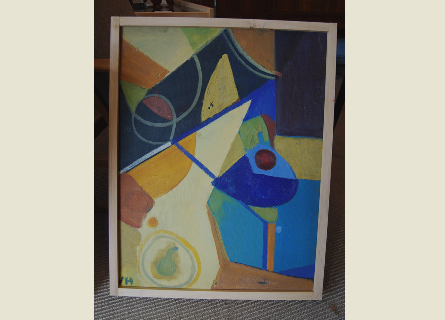 Abstract oil on board signed VH. Framed in solid oak frame.
