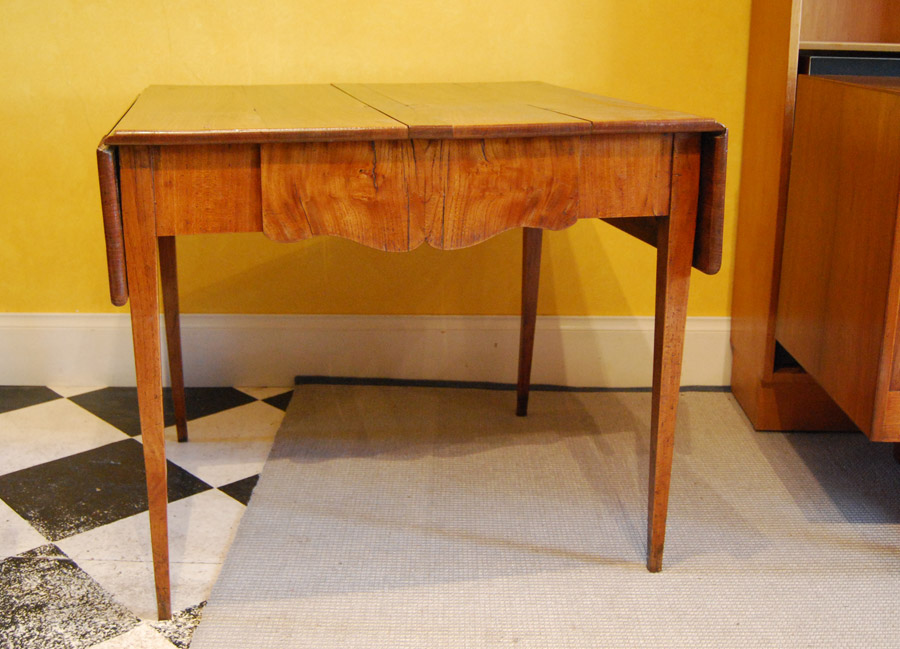 Delightful small antique fruitwood country drop side table. Drawer to one side with shaped apron to two sides. Length with sides down is 890mm.