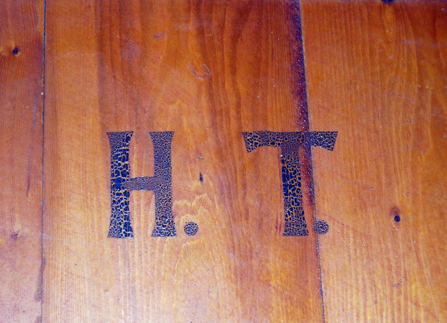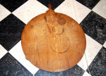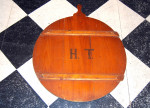 Antique wooden dough board. Initialed H.T. Lovely patina, as found. 67cm diameter.