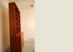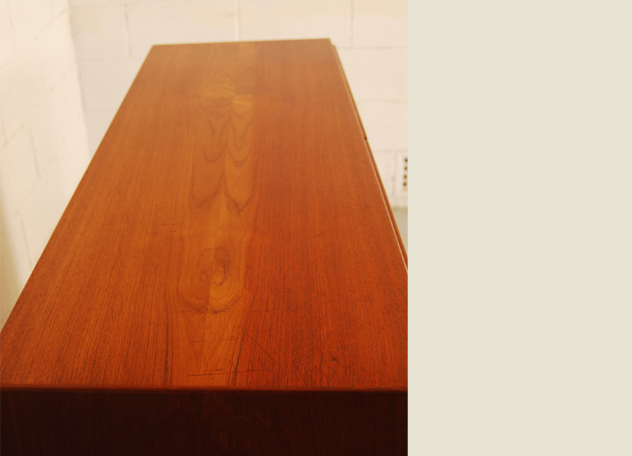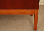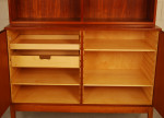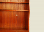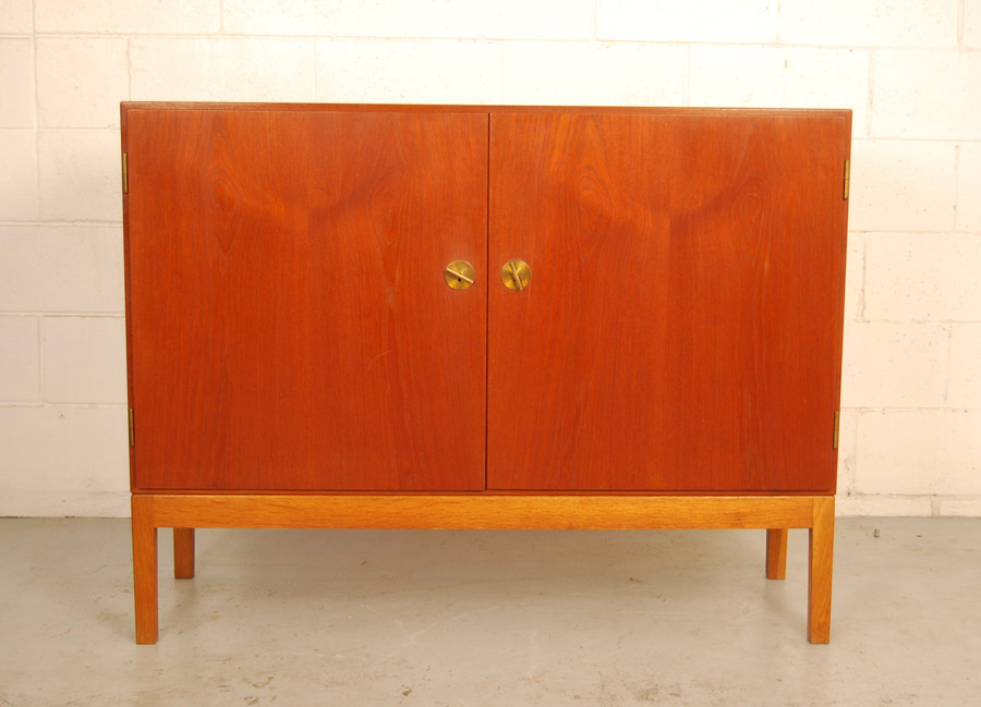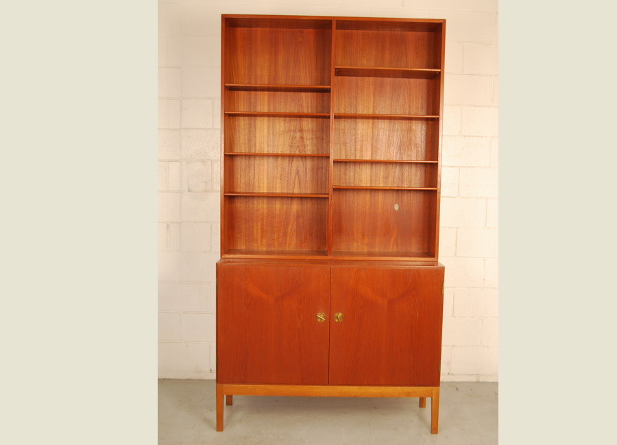 Borge Mogensen designed teak and oak bookcase on cabinet. Cabinet has interior drawers and shelves. Original brass key handles. Two small holes to back of bookcase and cut outs of the rear of one shelf to allow for hifi. Re-moveable bookcase if desired.