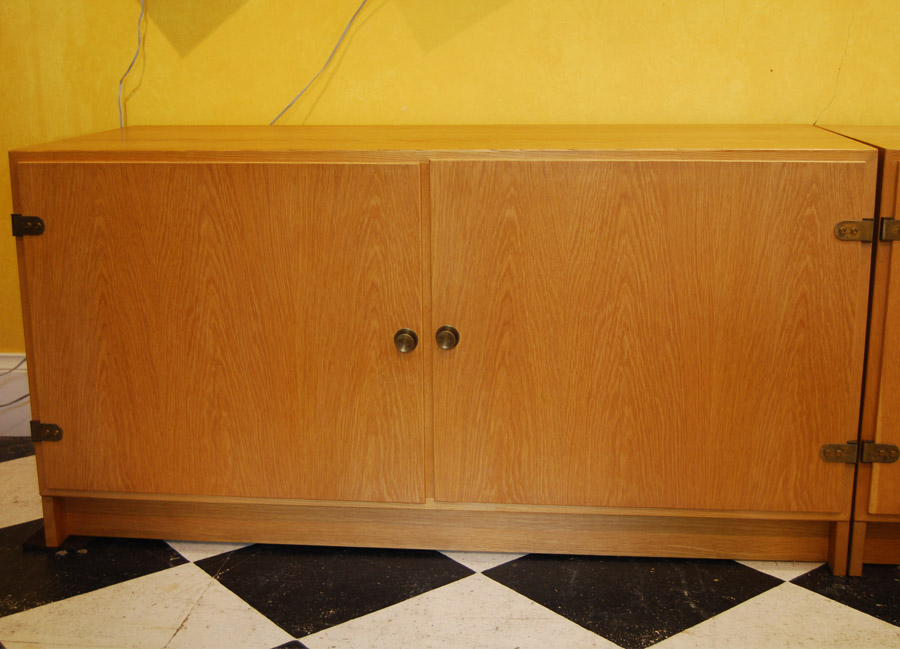 A pair of oak cabinets by Borge Mogensen available. Fully restored condition. Interior shelves. Can be sold as a matching pair ($2500) or individually at $1250 each.