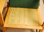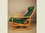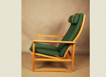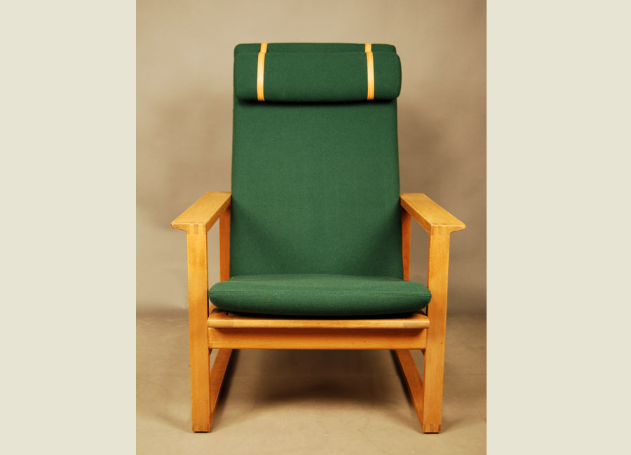 Borge Mogensen oak high back sled chair in original green wool. Back reclines or sits upright.