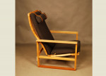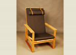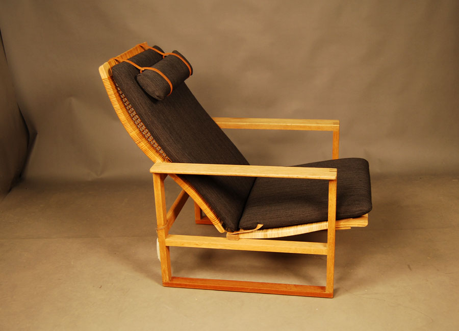 Danish oak, teak and cane high back sled chair, designed by Borge Mogensen. Seat and back cushions fully re-upholstered in Danish Art Weaving "Ask". Timber is soap treated and seat has been re-caned.