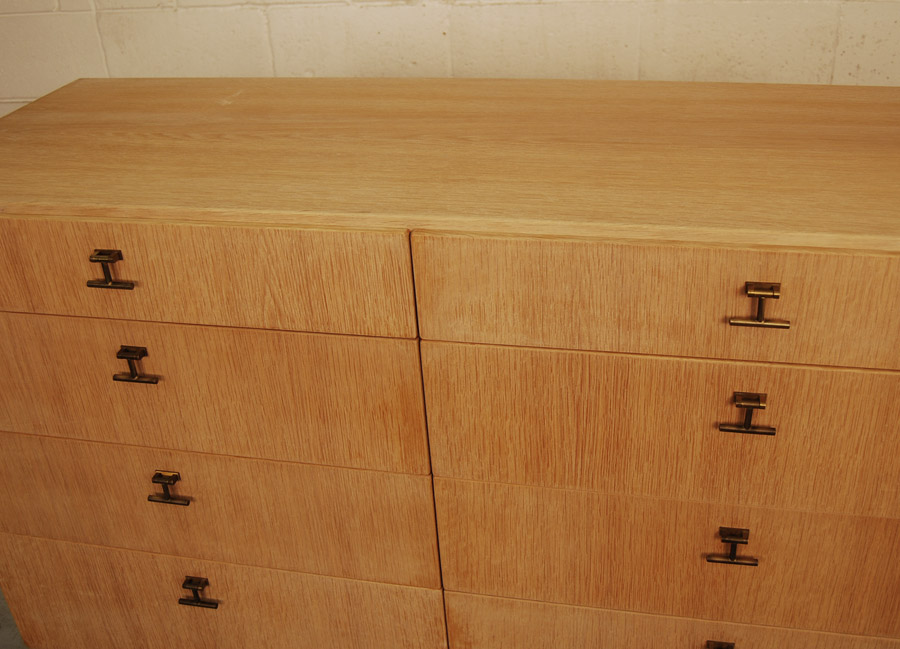 Danish oak bank of eight drawers with brass drop handles. Soap treated finish.