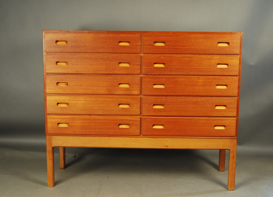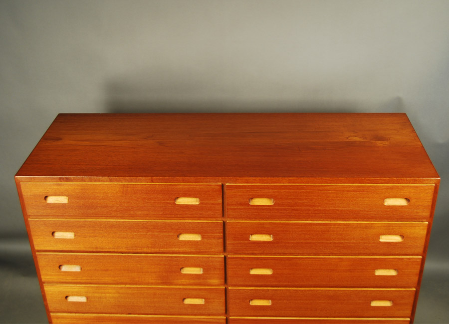 Teak and oak bank of 10 drawers designed by Borge Mogensen. Excellent large storage drawers. Fantastic condition.