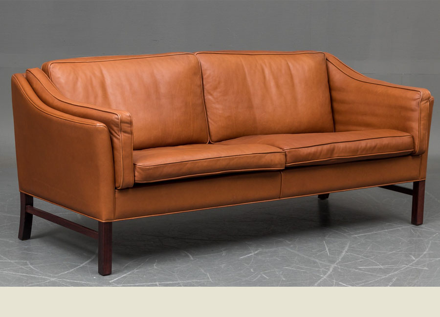 A superb Danish cognac coloured leather two and a half seat sofa by Grant Mobelfabrik. This is a high quality sofa in excellent condition. We have a pair of armchairs to match in stock.