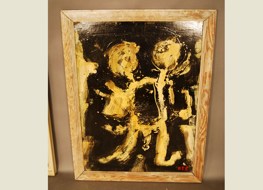 Danish abstract painting. Black and white figures. Initialed KFC.