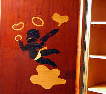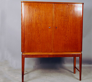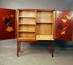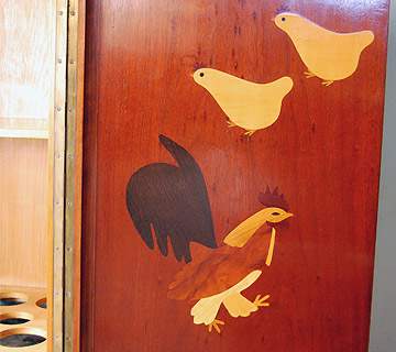 Danish mahogany cocktail/drinks cabinet with fantastic inlay detail to interior. One door has a cheub with a cigar and the other a rooster and chicks.Circa 1940-50. A real curiosity piece! There are interior shelves for glasses etc. and a bottle storage area with zinc tray underneath for all your drinks!