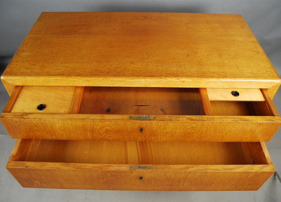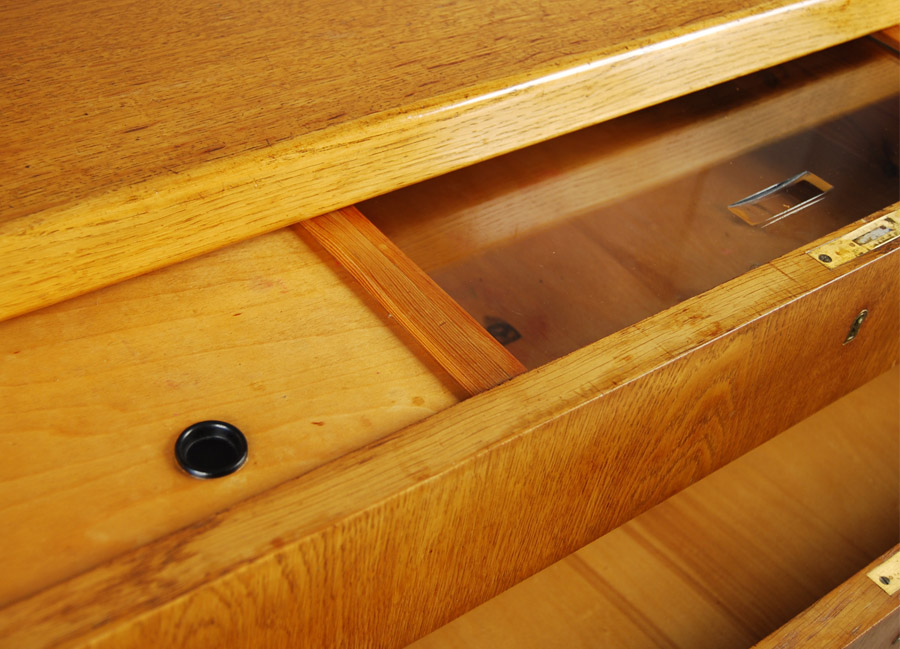 Early modern Danish oak chest of drawers. Top drawer separated with slide covers, two timber covers, one glass. Excellent condition.
