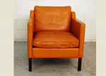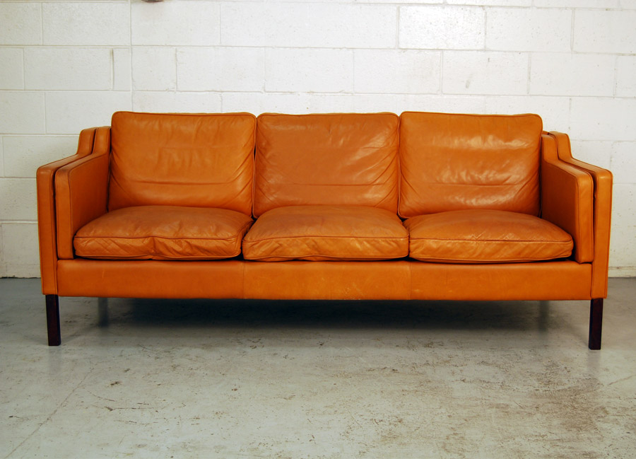 Beautiful cognac leather Danish "Stouby" three seat sofa and single chair. Some patina to leather, very comfortable.