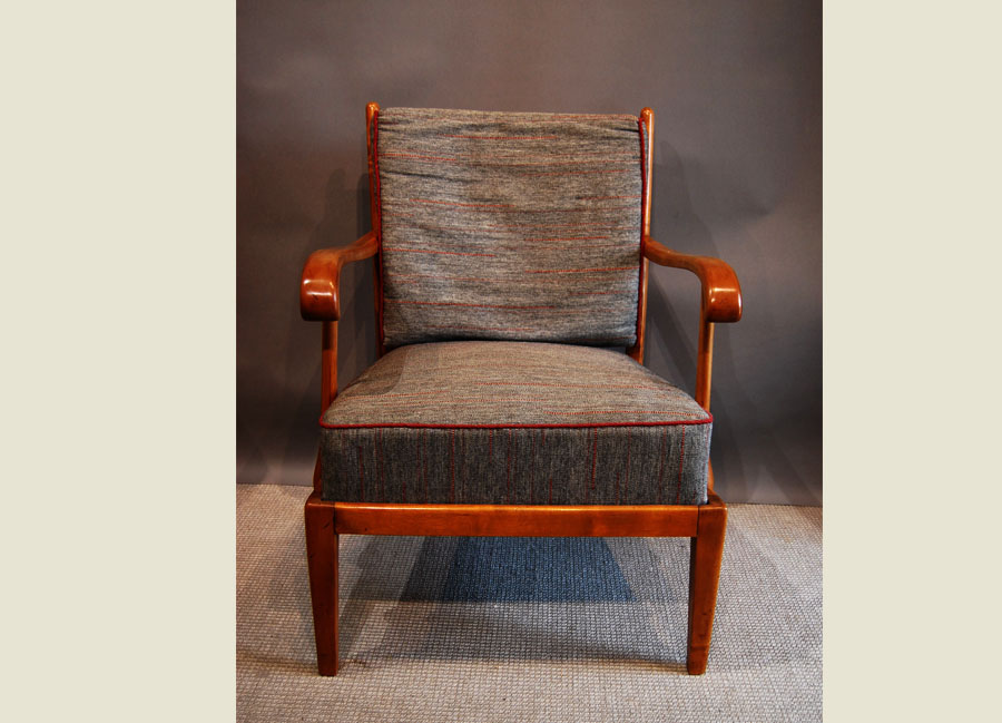 Danish modern beech armchair with original cushions. Grey wool with red intermittent stripe.