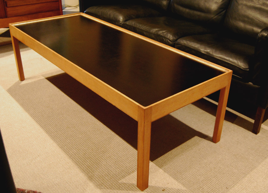 Danish oak coffee table with black formica top. Formica with some patina, marks and scratches.
