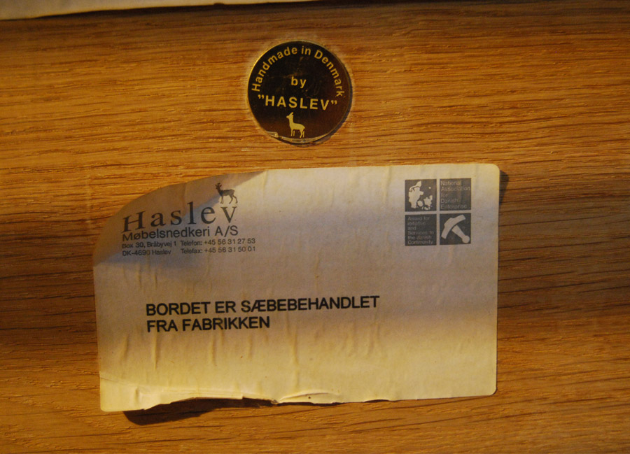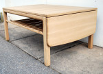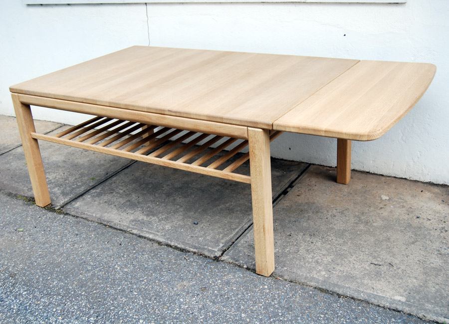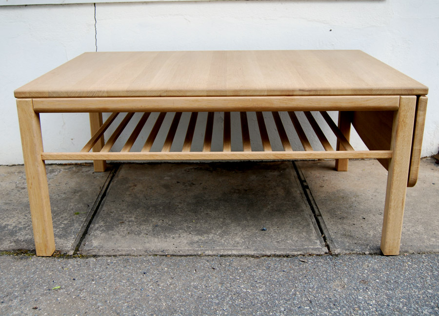 Danish soap treated oak coffee table manufactured by Haslev.. Slatted under shelf, drawer and one drop side. Makers label underneath. Length with drop side folded up is 1530mm.