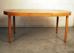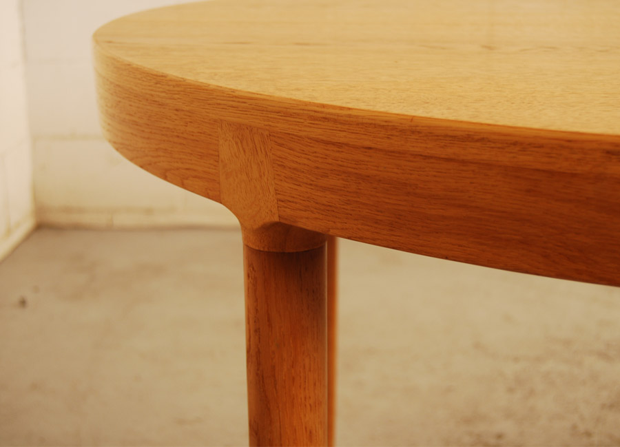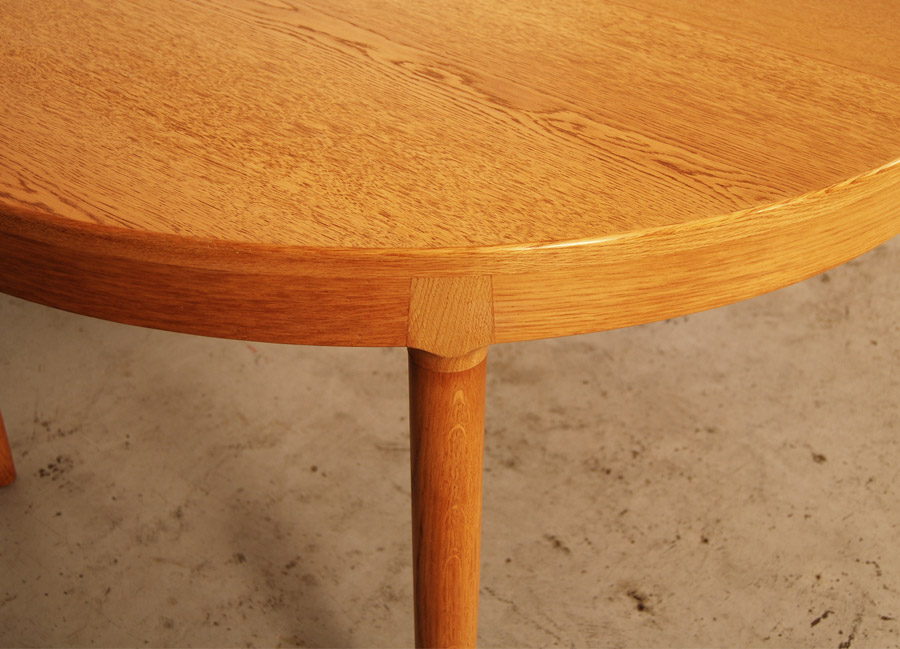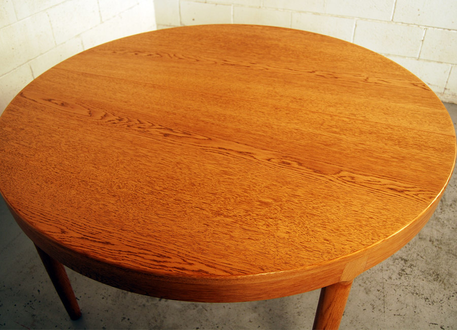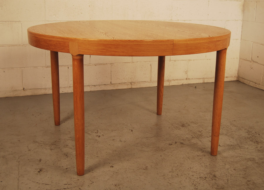 Danish oak extension dining table. Can be a circular table of 1210mm diameter or extended to oval with two extension leaves of 495mm each. Only one leaf has side rails.
