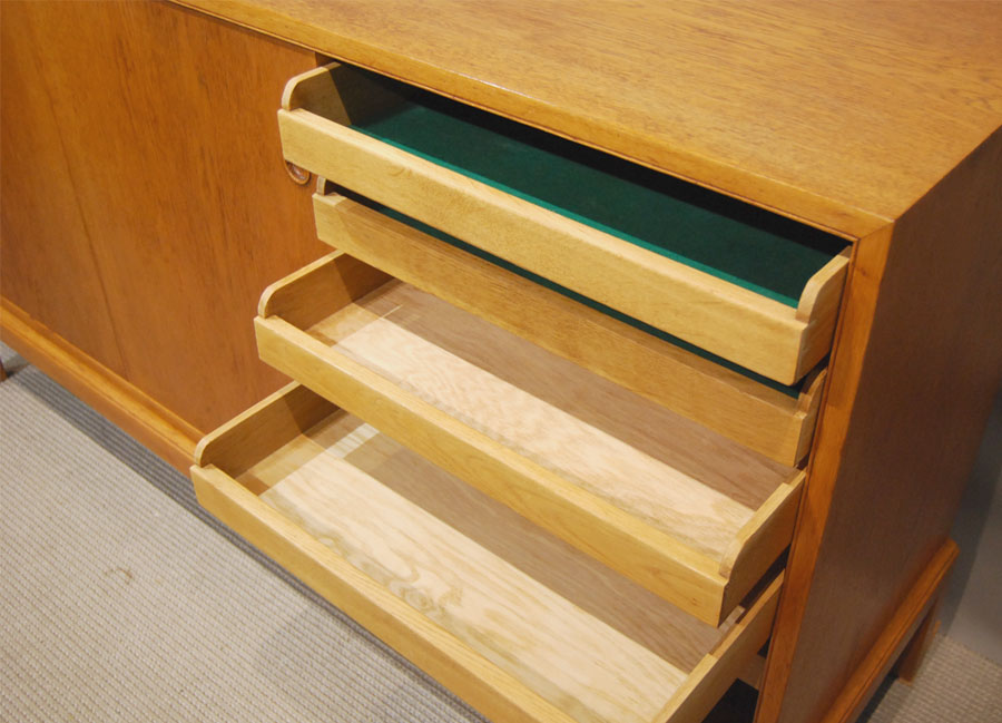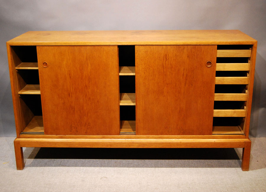 Danish early modern oak sliding door cabinet, with interior shelves and drawers to interior at one end.