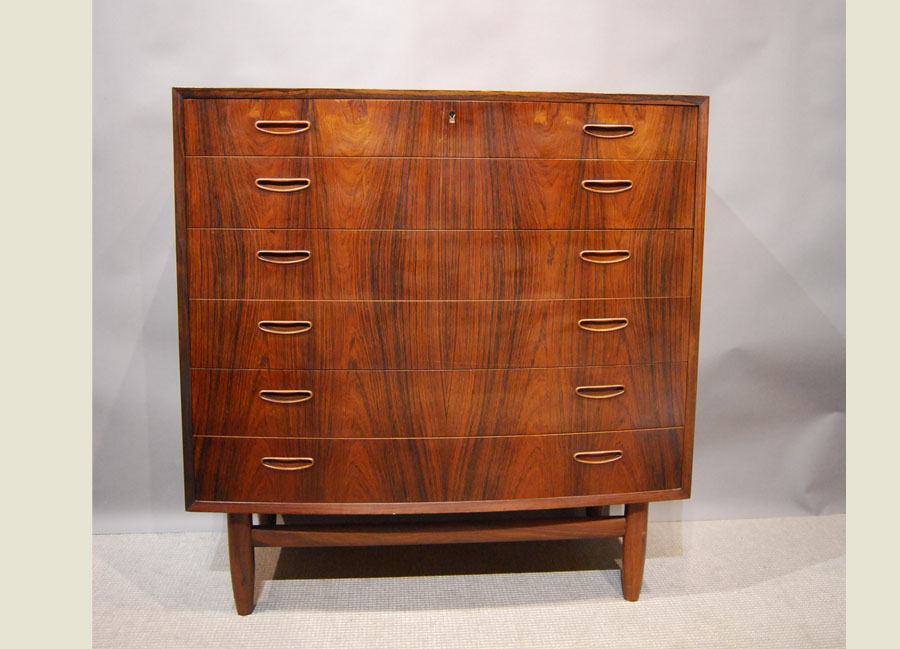 A very beautiful Danish rosewood bow front chest of six drawers. Magnificent grain pattern.