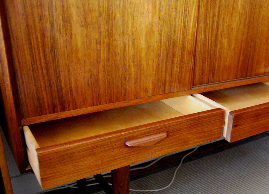 Danish rosewood buffet with sliding doors and interior drawers. Excellent condition and quality. Shown as found, price includes restoration.