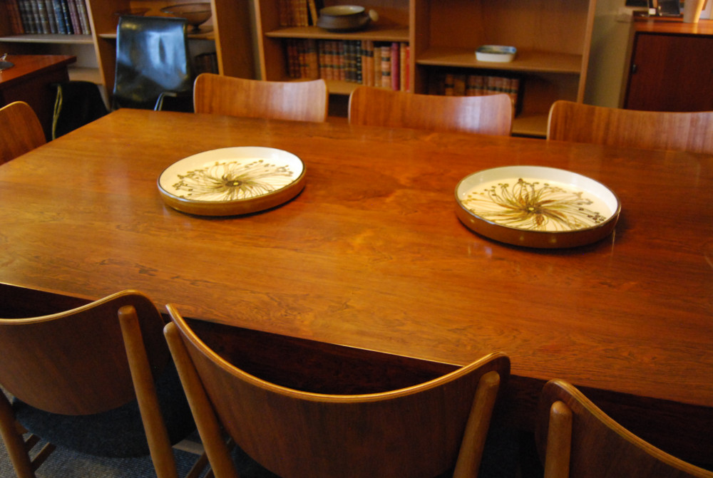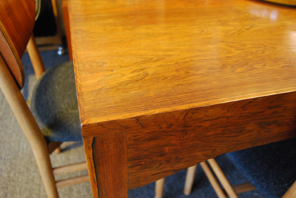 Large Danish rosewood rectangular dining table. Hard to find! Has now been restored and is in the shop! A couple of small burn marks to top.