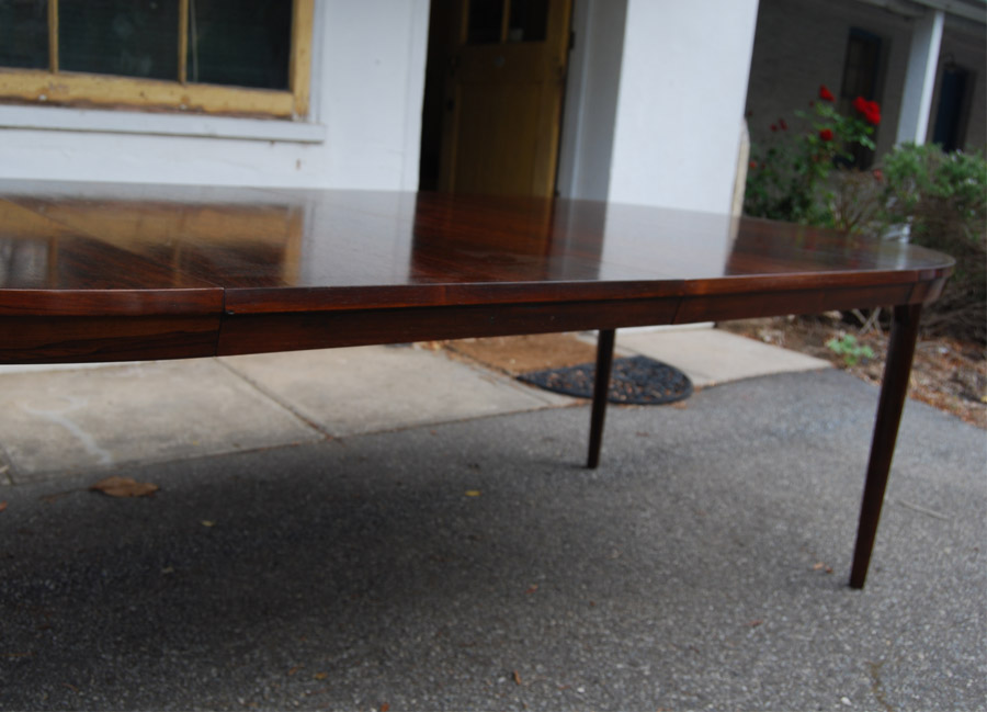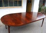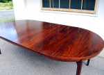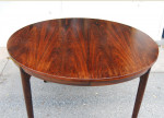 Danish rosewood circular table with two extension leaves with rails to sides. Excellent condition. Diameter 1200mm. Leaves are 565mm each in length. Fully extended length is 2330mm.