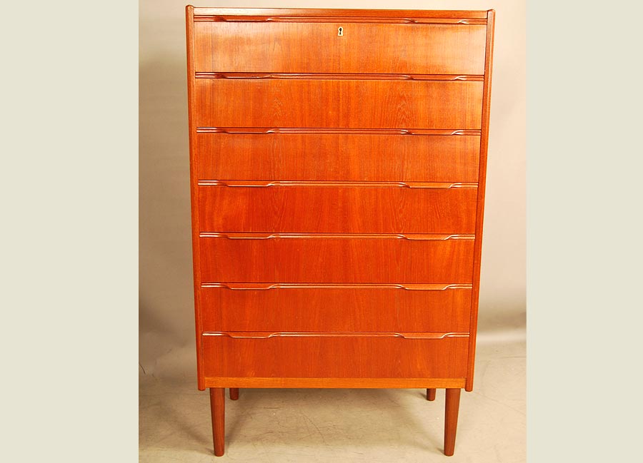 Danish teak chest of seven drawers with tab handles. Completely restored with drawer runners renewed. Very nice quality piece.