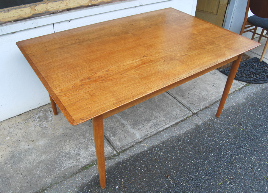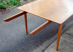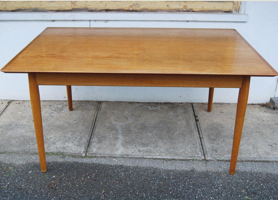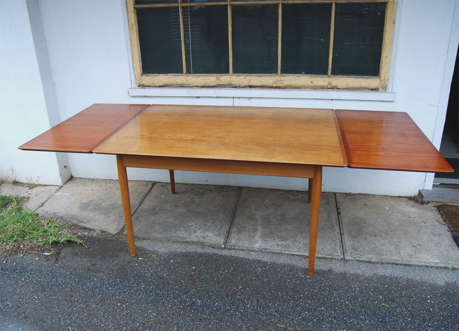 Danish teak and oak extension dining table. Leaves easily store on a shelf under table top. Colour variation between top and leaves as shown. (Photographed with set of eight Niels and Eva Koppel chairs 33D014) A small veneer repair to side rail. A great table with nice colour and patina. Length without extensions is 1520mm.