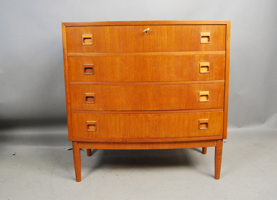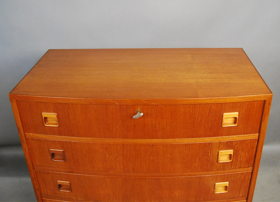 Danish teak bow front chest of four drawers. Restored condition.