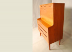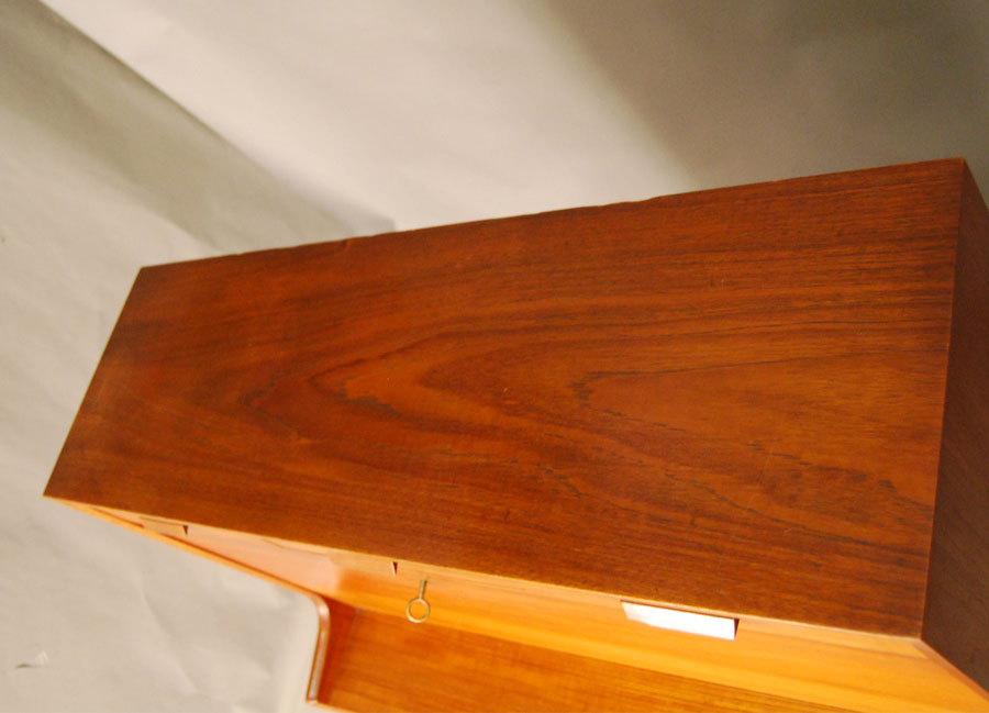 Danish teak bureau with chest below. Small drawers at top and drop down door. Includes original brass light fitting, which requires Australian plug. Very good condition.