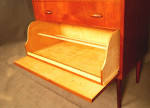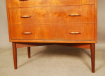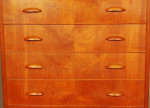 Danish teak chest of drawers with wild teak grain. Unique shoe drawer feature at the bottom. Lower drawer fronts drop down and pull out to reveal shoe section. Very good condition.