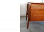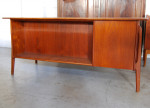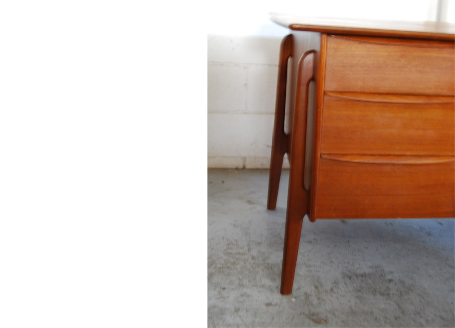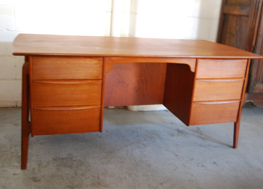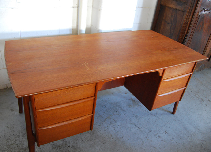Danish teak desk with splayed legs. Bookshelf at rear. Shown as found, price includes restoration.