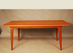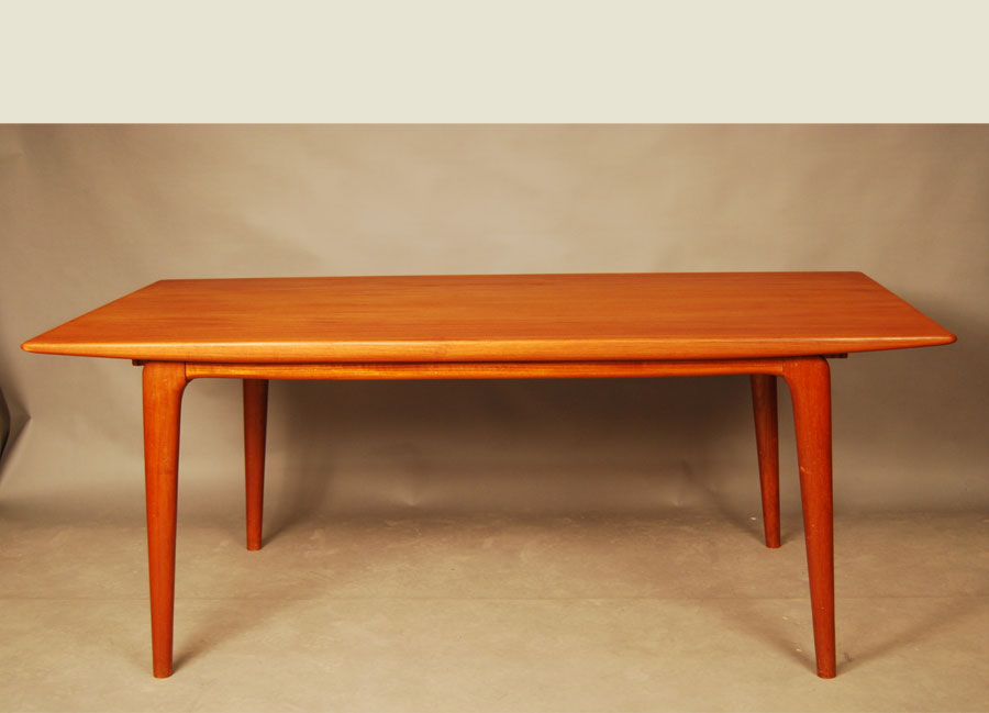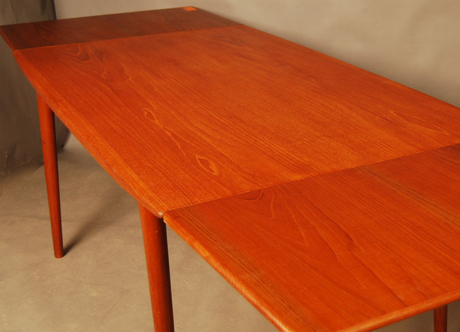 High quality Danish teak extension dining table.Tapering edges and width, a lovely design Leaves are stored in a drawer at end of table. Extended length is 2485m. Excellent condition.