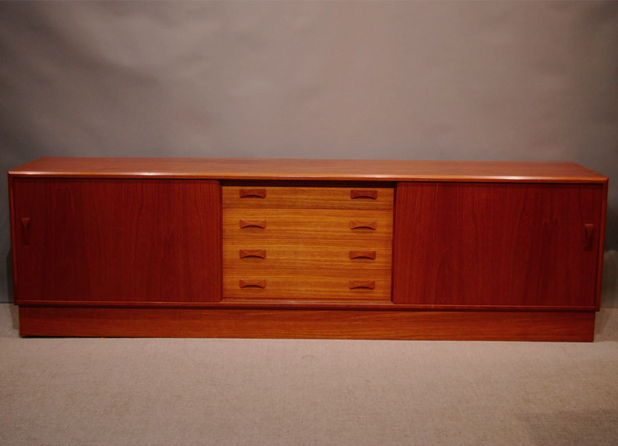 A lovely Danish teak low sideboard on plinth base. Two sliding door with interior shelves and centre drawers.
