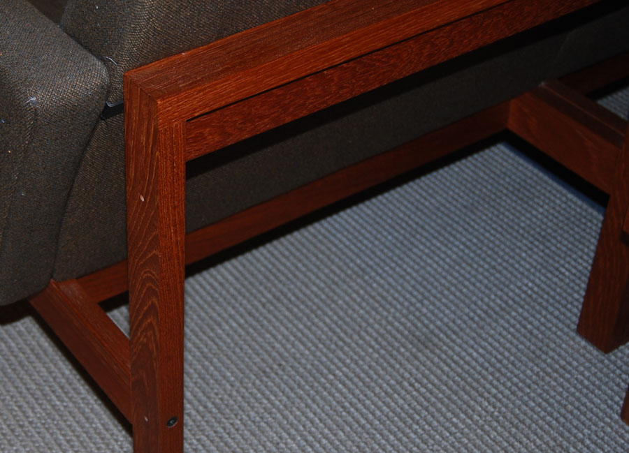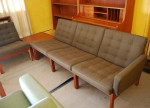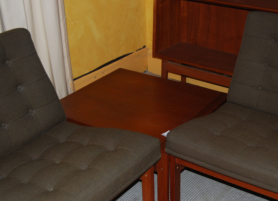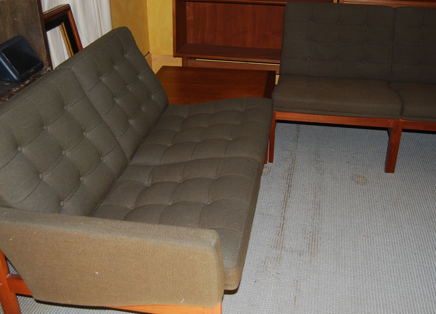 Danish sofa suite by France & Sons in teak and original wool. Suite consists of a three seat and two seat sofa with corner coffee table. Very comfortable lowline suite. Two seat measures 1250 long. Corner table is 585 x 660 x 305. Three seat measures 1800 long.