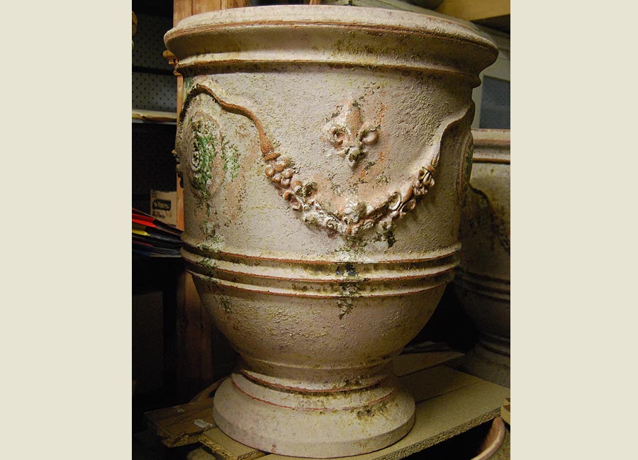Traditional handmade French prestige model Anduze terra cotta garden urn. Old antique finish. Completely handmade in France by traditional methods, signed and numbered by potter. A stunning addition to any garden, courtyard or interior.
