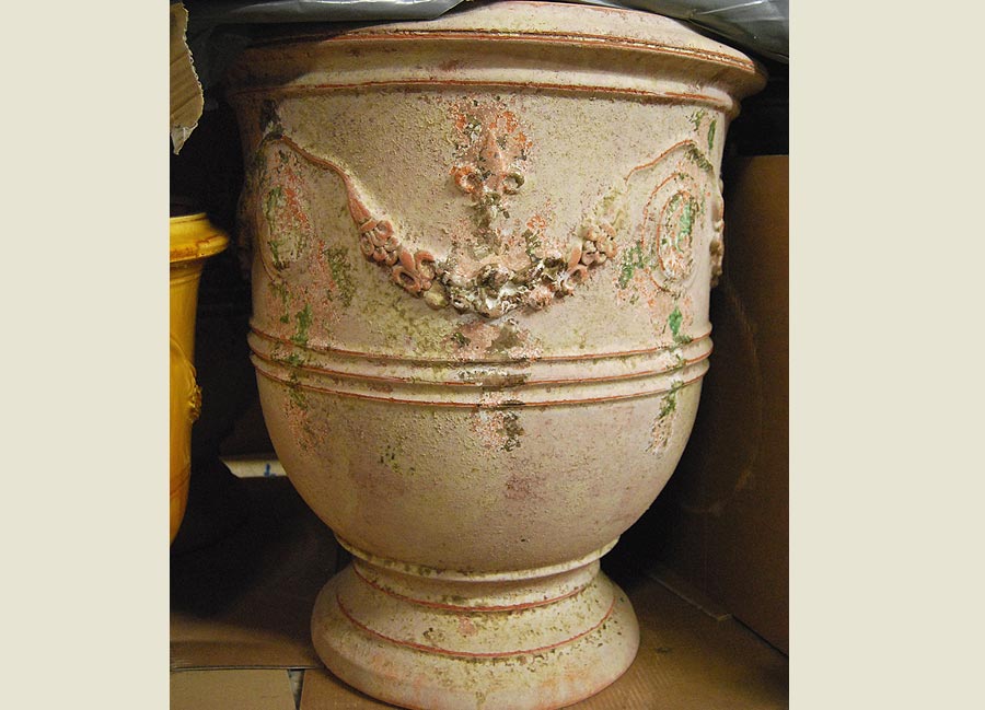 Traditional handmade French prestige model Anduze terra cotta garden urn. Old antique finish. Completely handmade in France by traditional methods, signed and numbered by potter. A stunning addition to any garden, courtyard or interior.