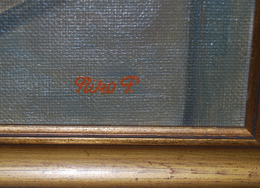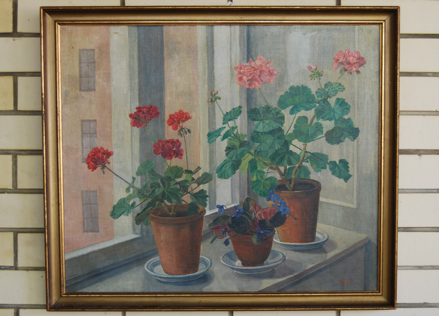 Lovely painting of potted Geraniums and African violets on window ledge. Signed Nico Petersen.