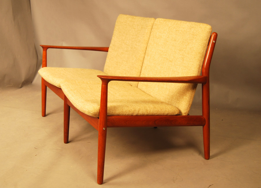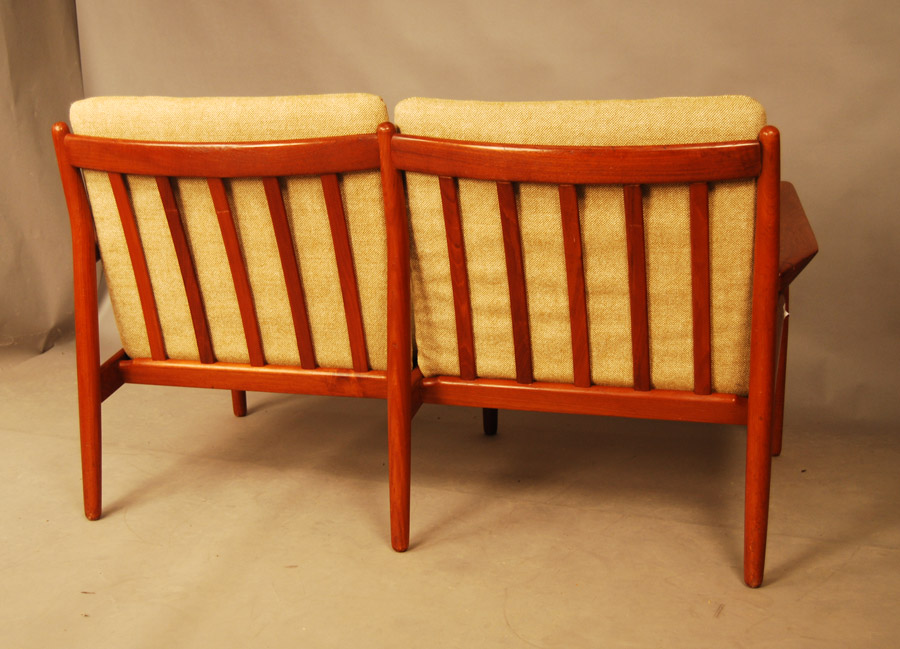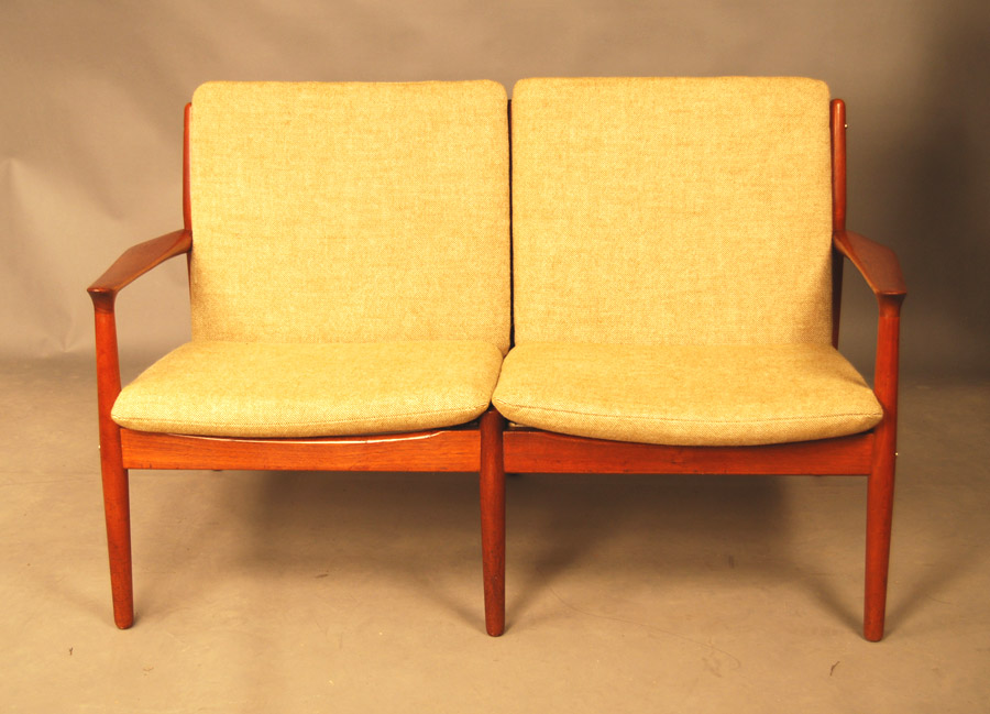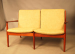 Danish teak two seat sofa designed by Grete Jalk. Original cushions and Danish light coloured wool. Re-uppholstery can be arranged at extra charge if required.