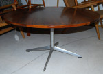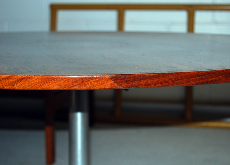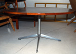 A gorgeous coffee table by H.W. Klein for Bramin. The top is constructed of Brazlian rosewood which has good contrasting grain patterns. The aluminum base is very streamlined and is the perfect contrast to the rosewood top. It is in excellent condition.