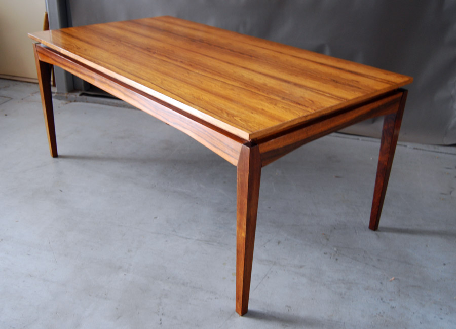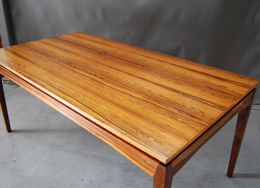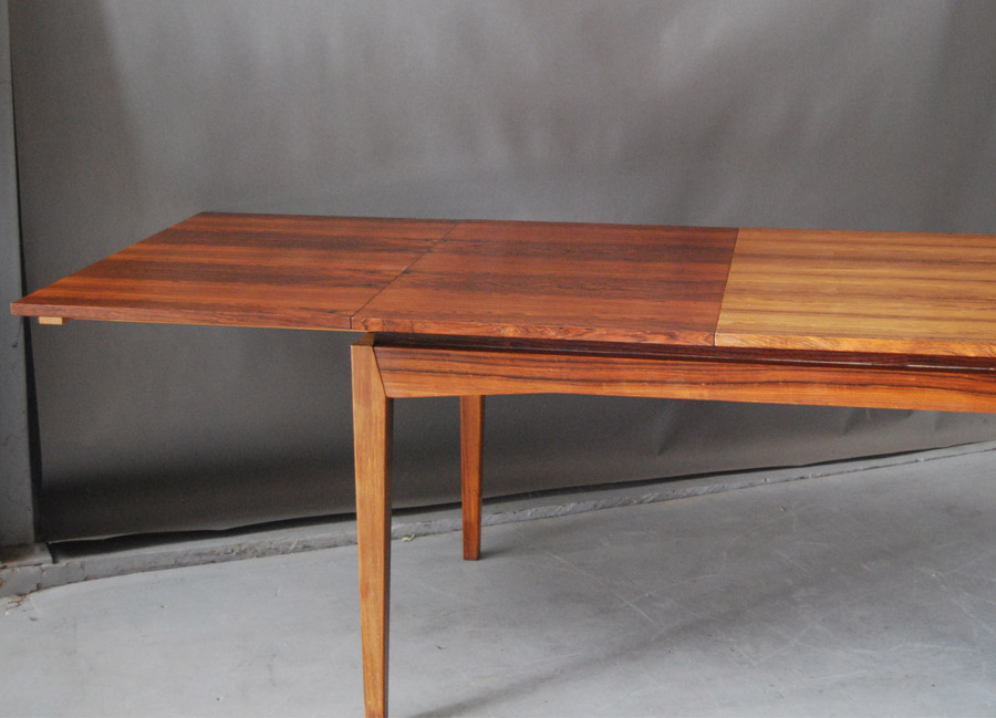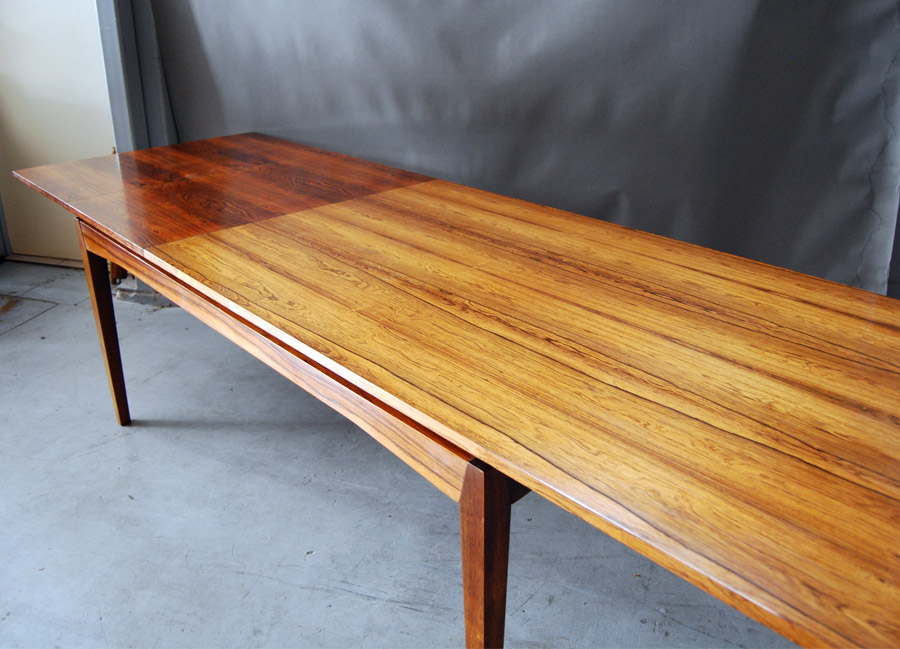 Danish rosewood extension table designed by H.W. Klein. A fantastic very large table with two leaves that store within the table. Colour difference between leaves and rest of top. Excellent restored condition. Length without extension leaves is 1690mm.