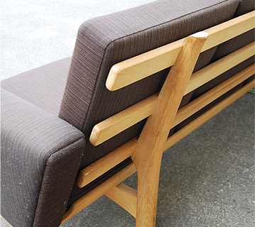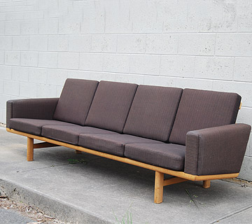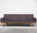 Danish oak four seat sofa designed by Hans Wegner in 1953. Manufactured by Getama. Great original wool with a few small holes and wear marks.
