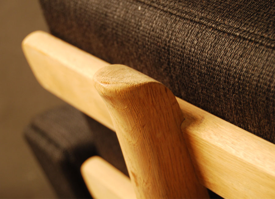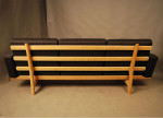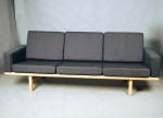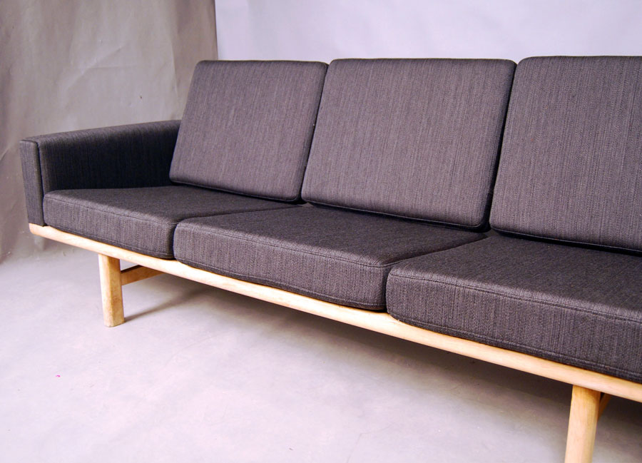 Hans Wegner designed soaped oak three seat sofa, model GE236. Manufactured by Getama, Denmark. This sofa has been fully reupholstered in fabric by Danish Art Weaving.Fabric type - 'Ask' 111. New foam seat and back cushions .