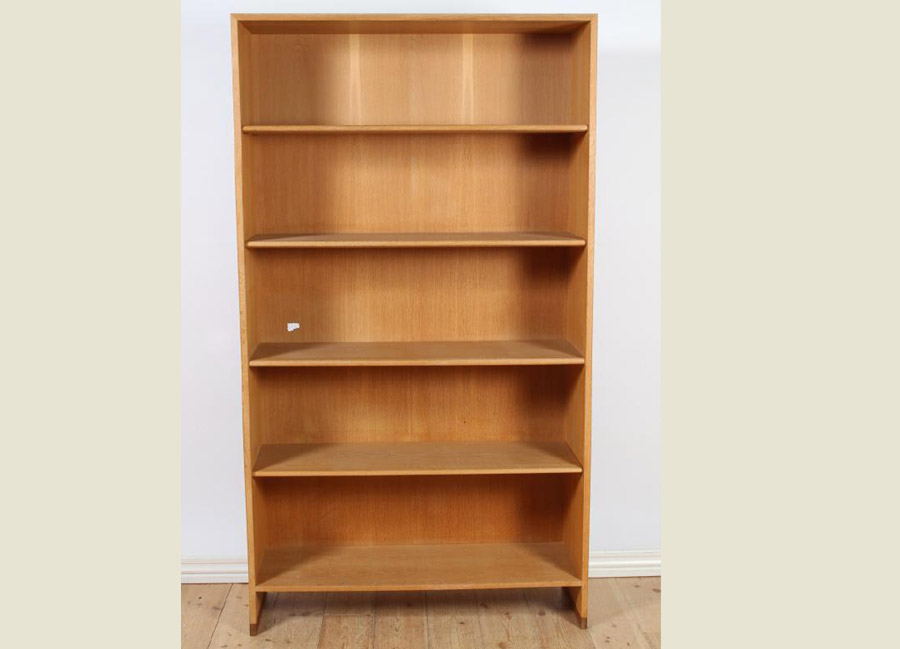 Hans Wegner designed oak bookcase. Adjustable height shelves. Price includes restoration.