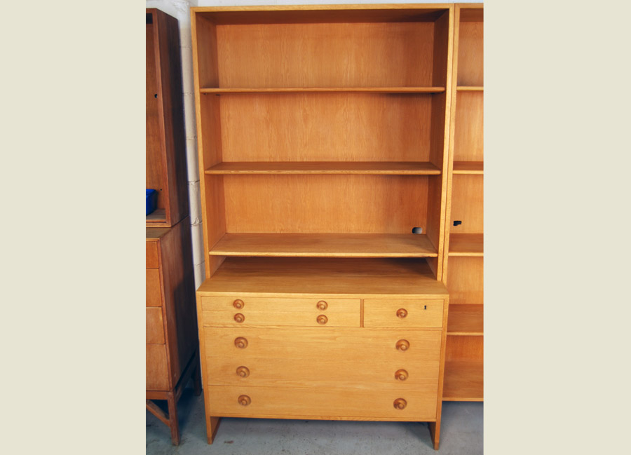 Danish soaped oak drawers with bookcase top designed by Hans Wegner. Beautiful condition. A small hole has been made in back to allow for stereo etc.