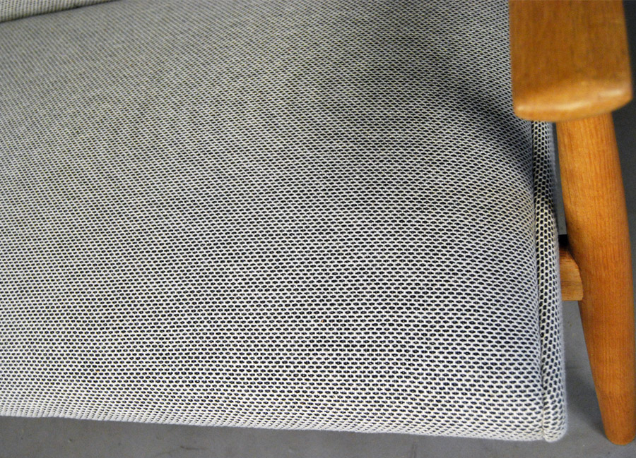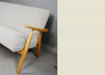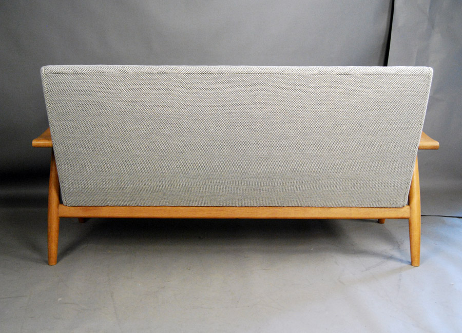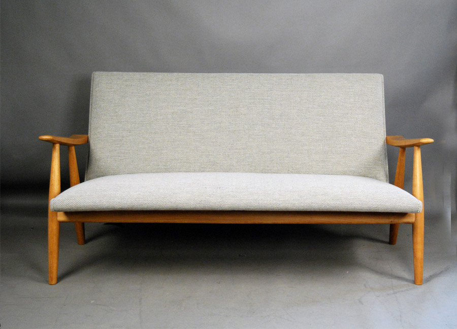 Danish soaped oak sofa designed by Hans Wegner. Model GE260 by Getama. Excellent condition. Fully reupholstered in Kvadrat Skifer this piece now looks stunning!