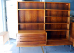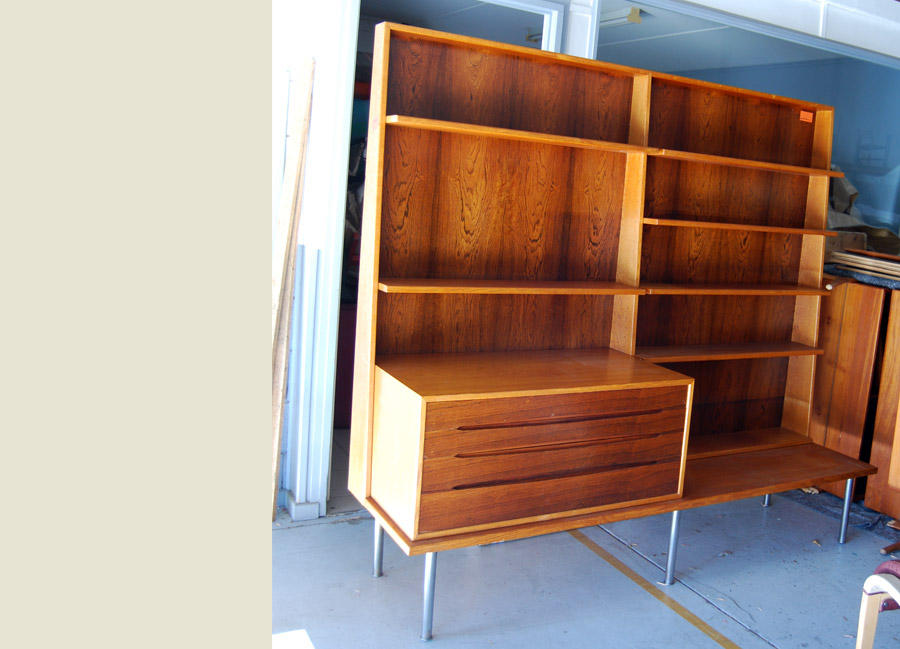 Rare attributed to Hans Wegner rosewood and oak bookcase wall system with shelves and drawer section on steel legs. Price includes restoration. Top tapers to 90mm depth at top from 550mm depth at base.