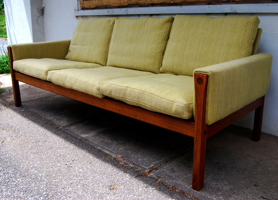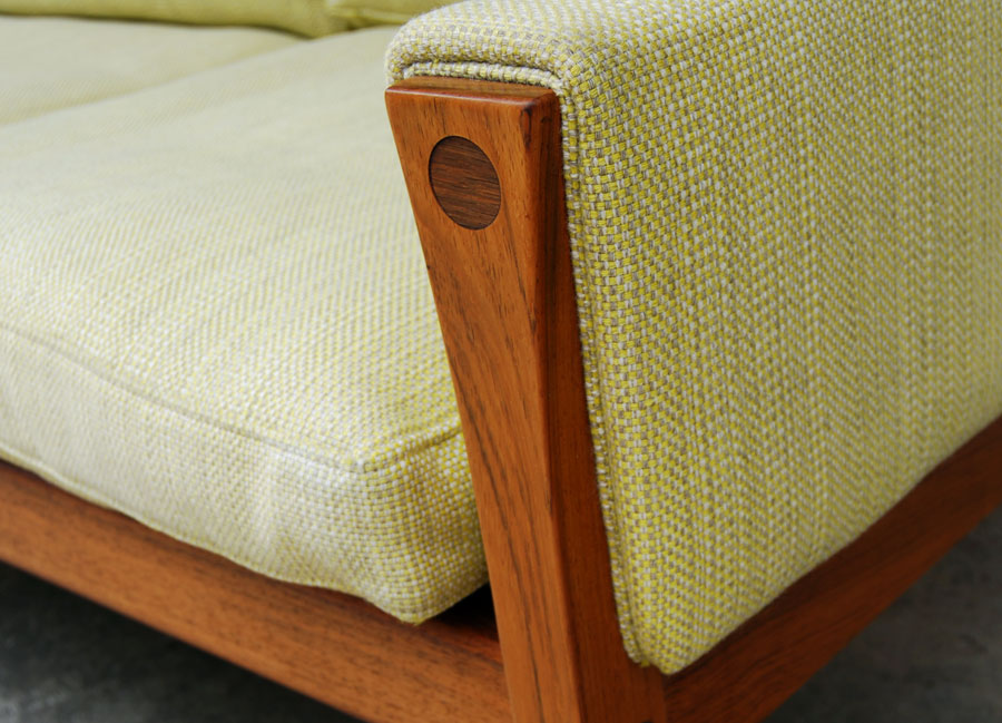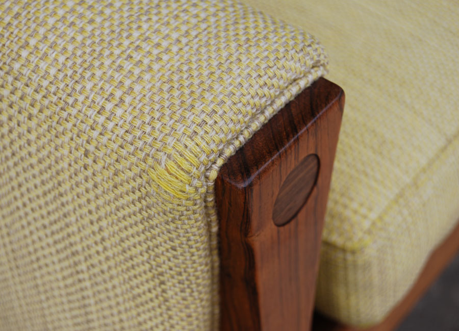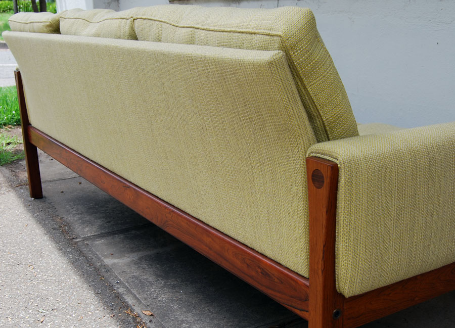 Impressive Hans Wegner 3 seat sofa with Brazilian rosewood frame, feather filled cushions. Original lemongrass cloured fabric.
