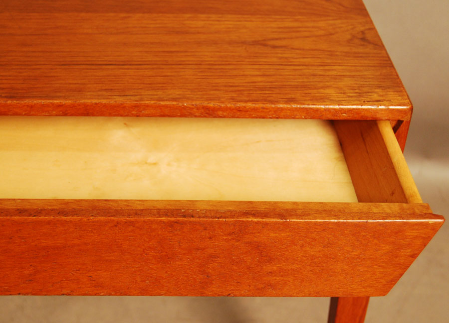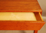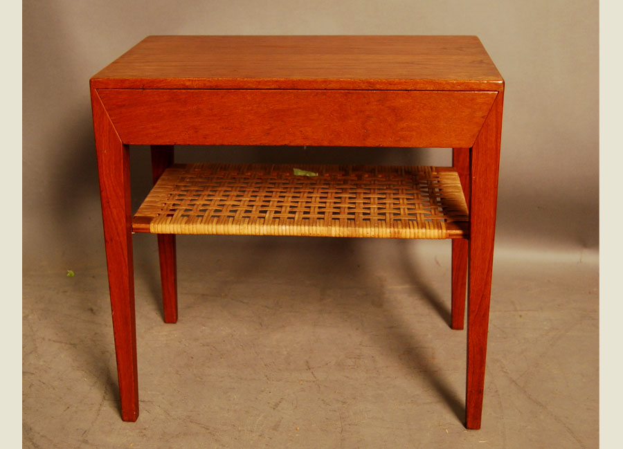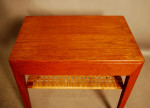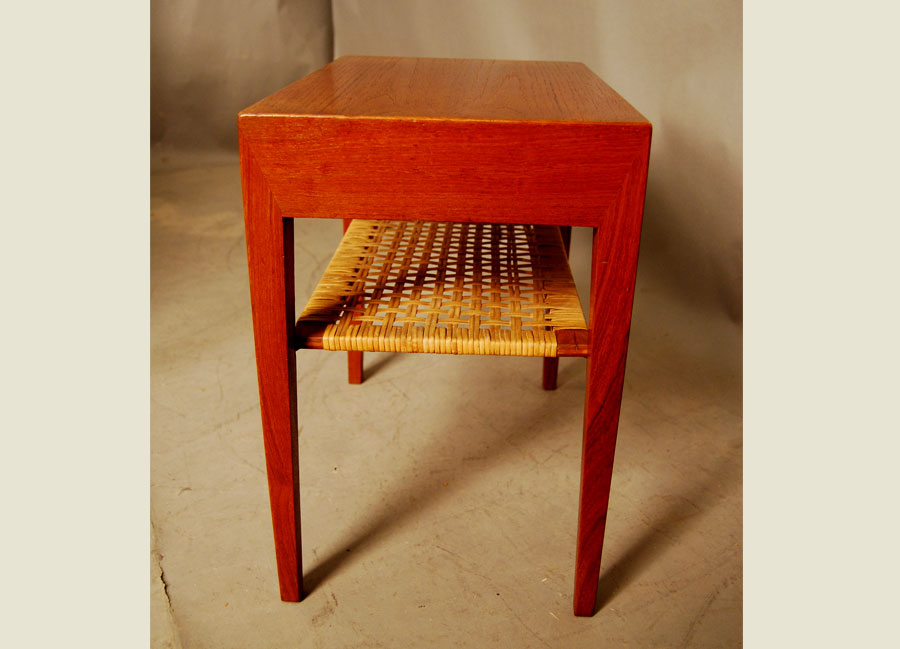 Danish teak side table with drawer and cane shelf by Haslev.